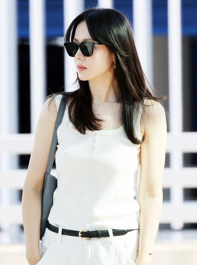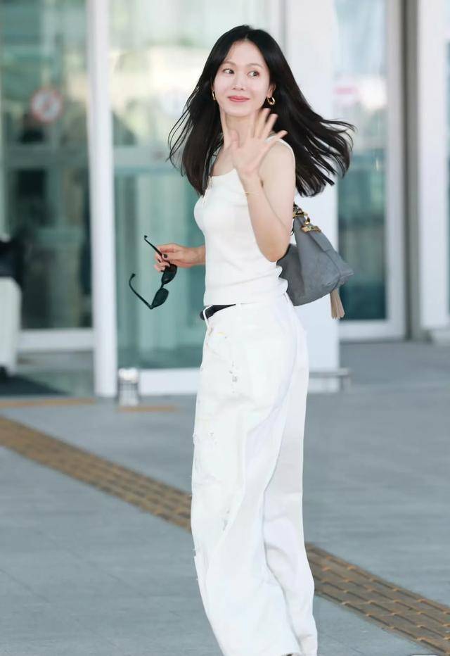 孙艺珍出发时选择了一身基础款穿搭,一身白,白色背心搭配白色牛仔裤,还有高跟鞋。她背的高跟鞋和包都是她刚拿下的新代言,价值不菲, 都在上万元左右。