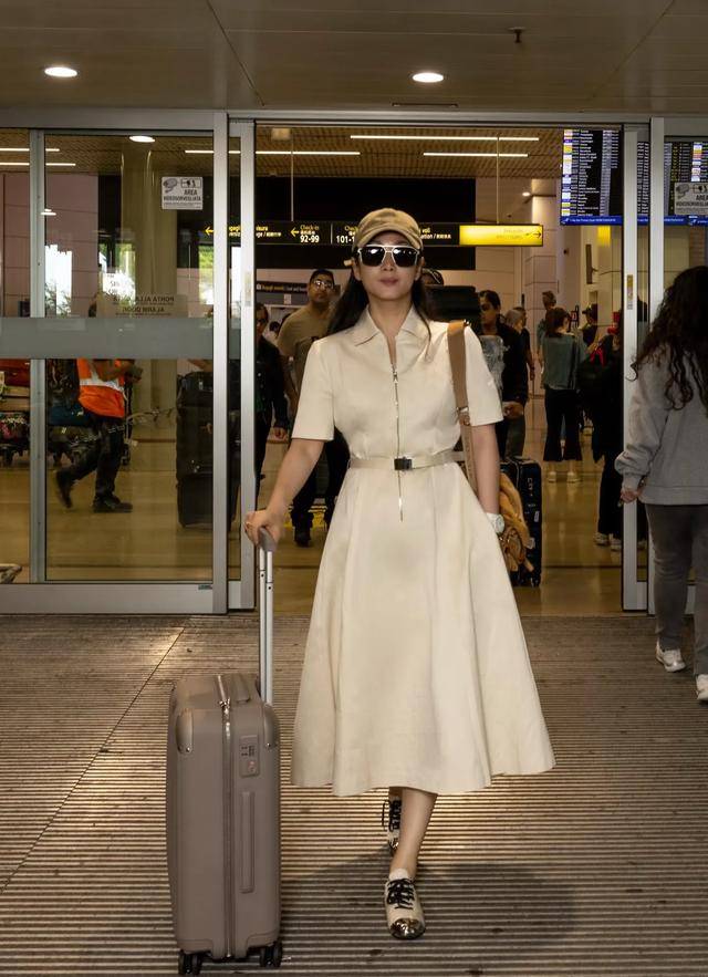 赵涛穿了一身白色活力裙装,戴着墨镜和帽子,自己拉着行李箱,单手插兜,一出场气场十足,太强大了,像都市丽人,像城市精英,太美了。